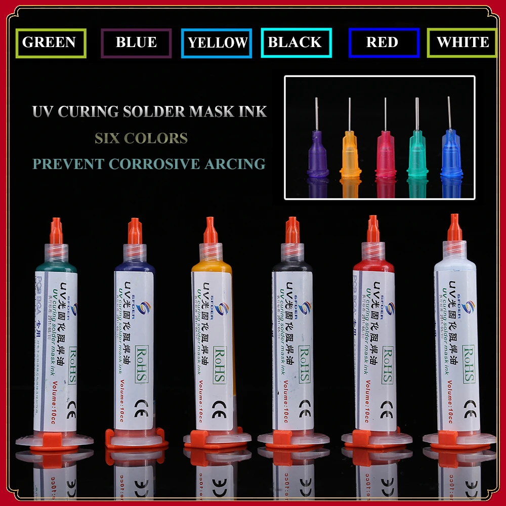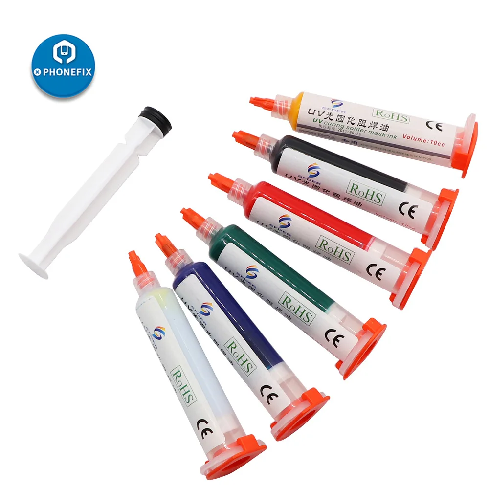 10 Cc Uv Gyógymódú Forrasztott Maszk Tinta Fekete/Kék/Zöld/Piros/Sárga/Fehér Hegesztő Olaj Bga Pcb Festék Megakadályozza A Korrozív Ívet