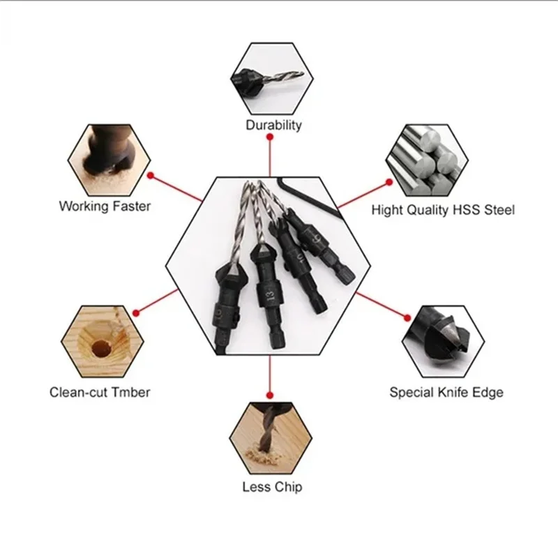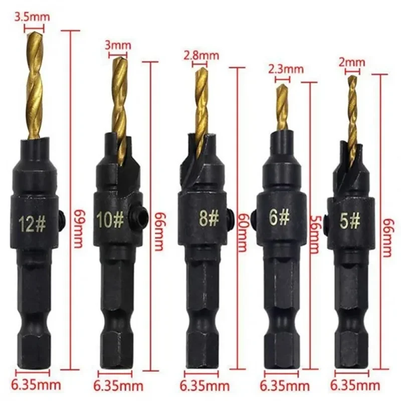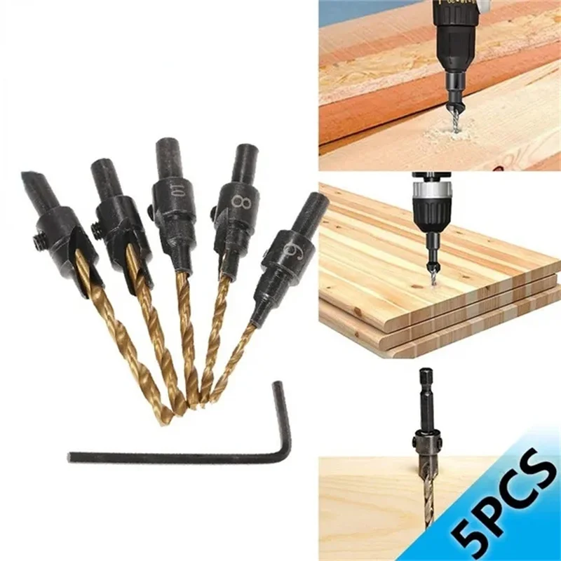 1/4 ‘ Hex Szárú Countersink 5Db Titanum Bevonatú Fúróbitek L-Wranch Hss Pilóta Csavarlyukak Famegmunkáló Fúró Bitkészlet