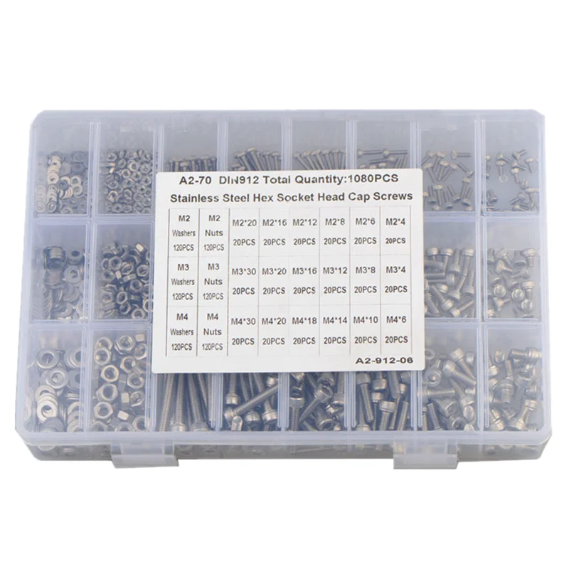 1080Pcs M2 M3 M4 Hex Aljzatfejű Cap Csop Rozsdamentes Acél Lapos Kerek Head Allen Csavarcsavarok És Anyák Alátétek Választéka