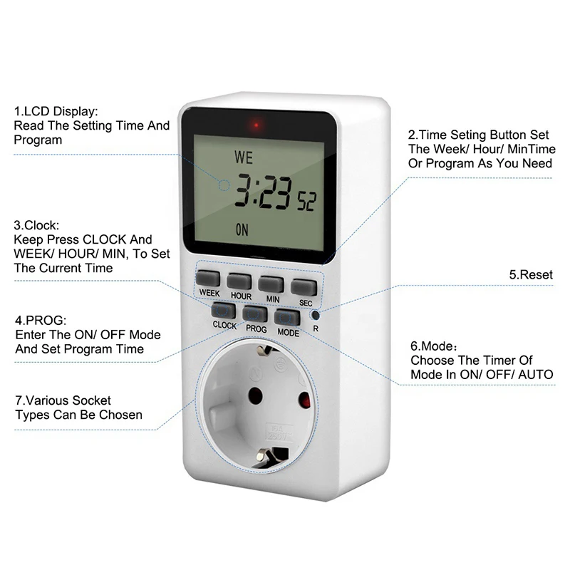 20 Csoport Beállítása Eu Us Uk Duge Elektrom Digitáli Kétrei Kapcsoló Kutékok 12/24 Órás Ciklikus Program Időzítő Aljzat