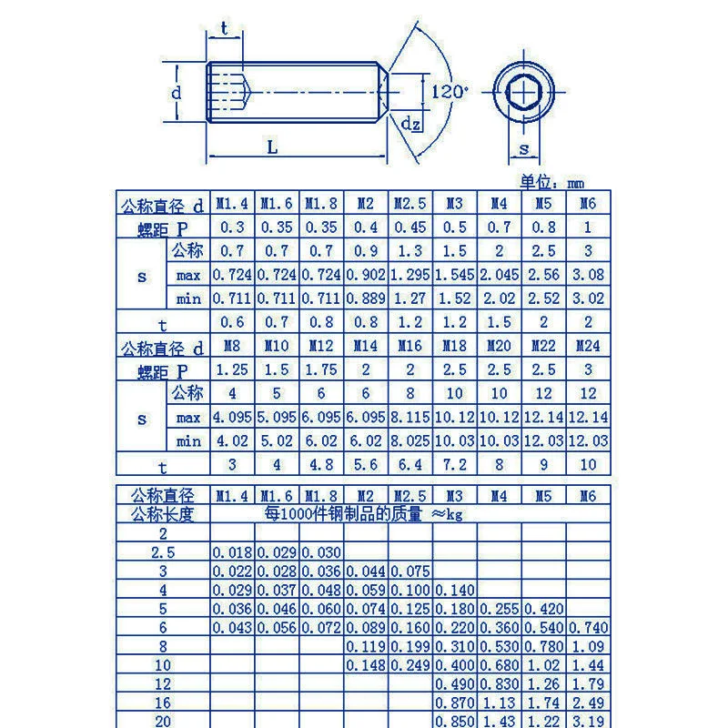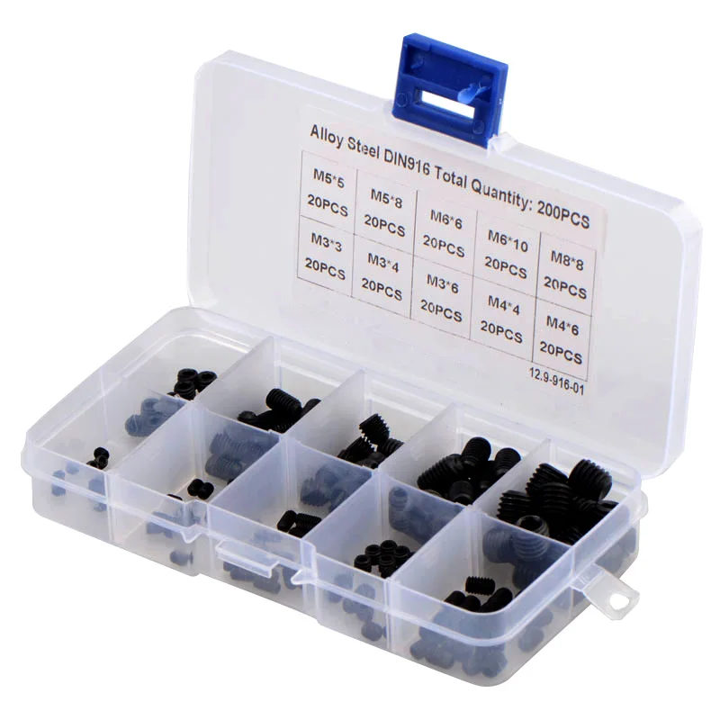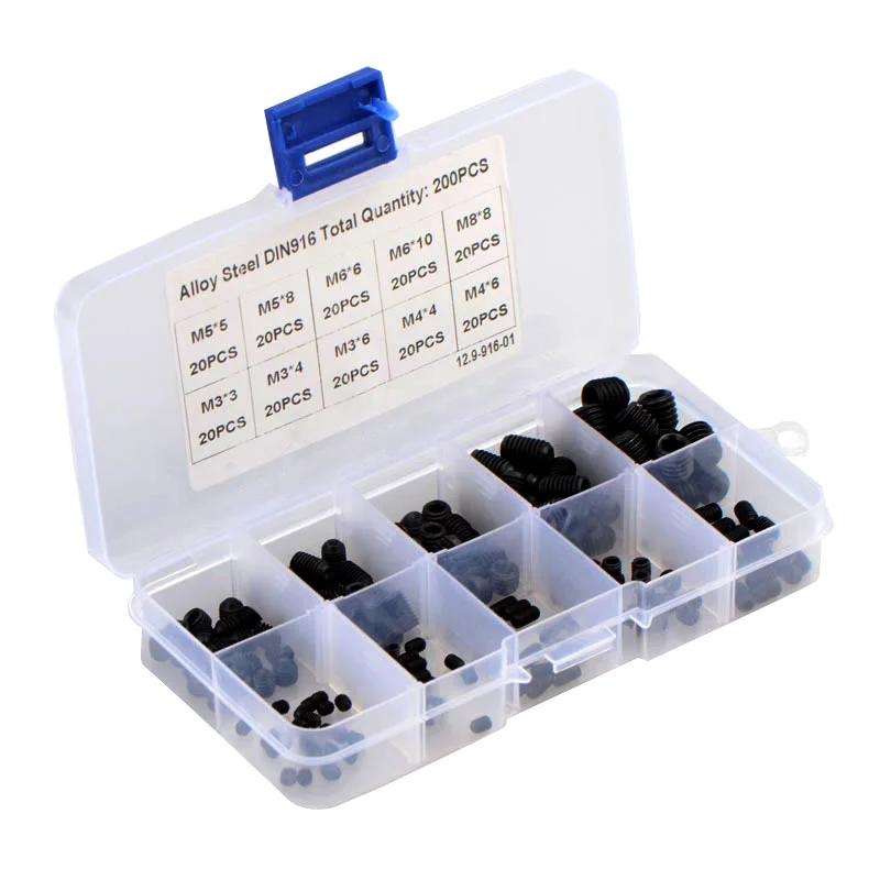 200Db -Es Hex Aljzatkészlet Csavarok Grub Csavaros Választék Készlet Szén Acél Fekete M3 M4 M5 M6M8 Cup Pont Set Din916 Boxed