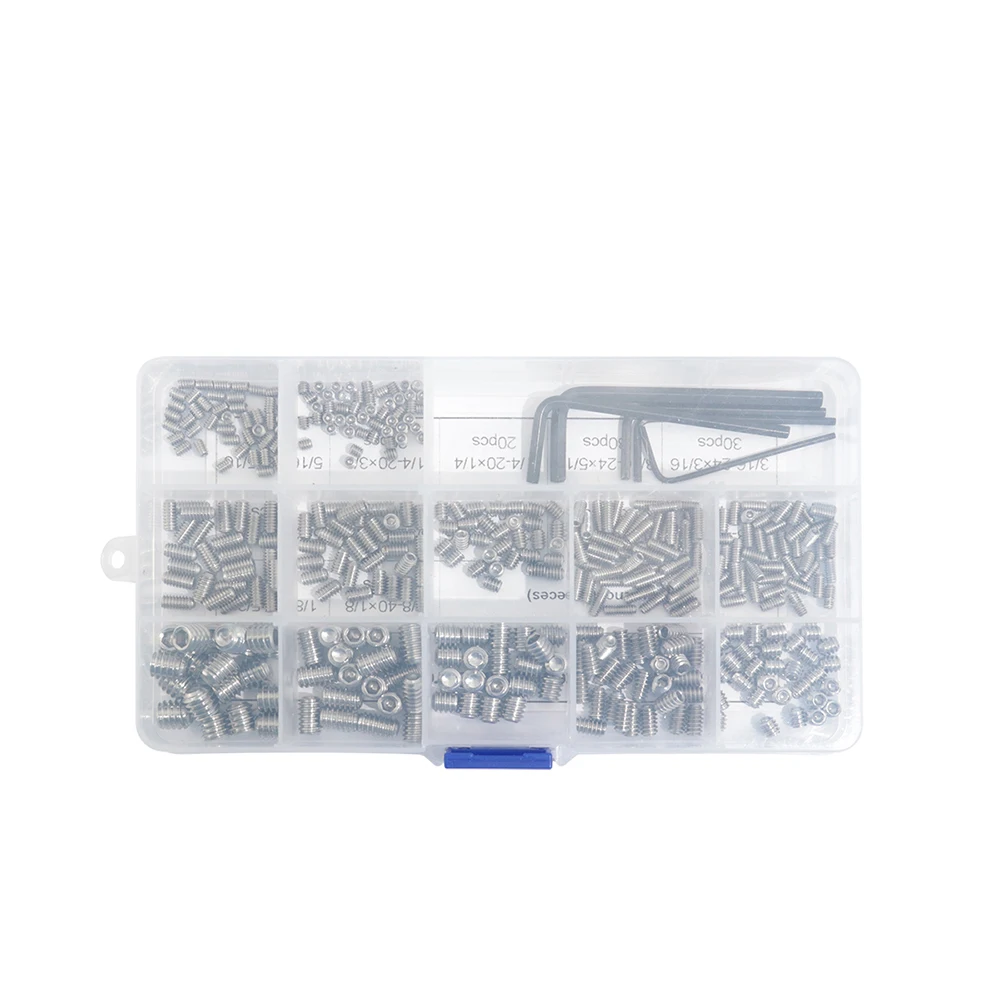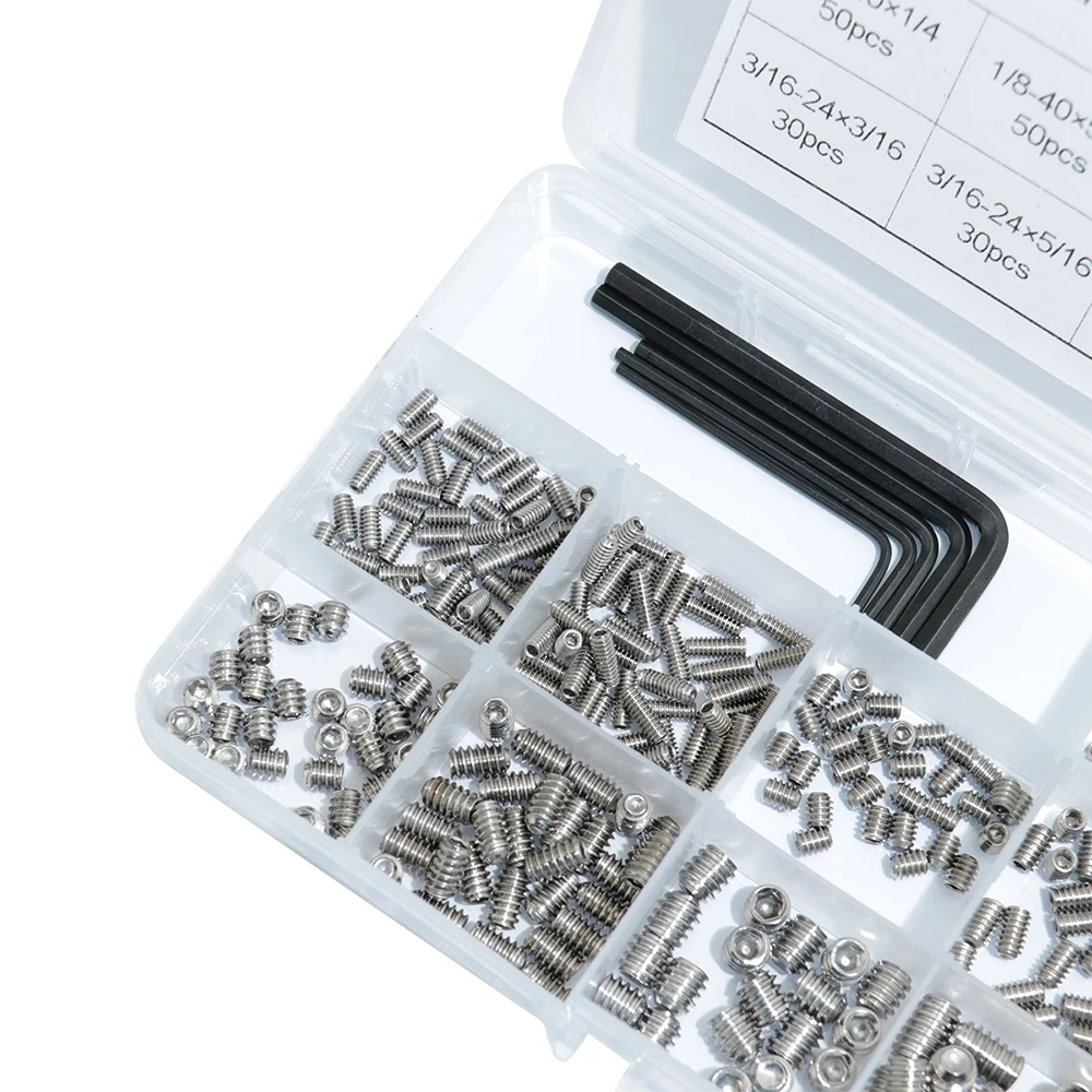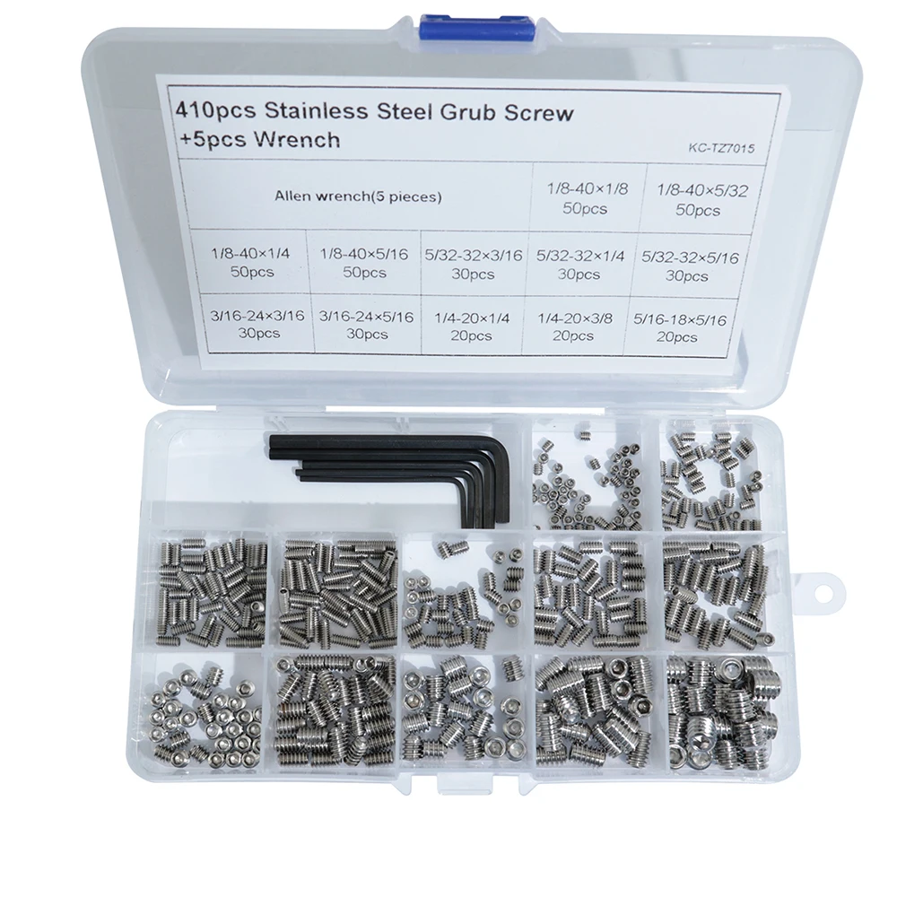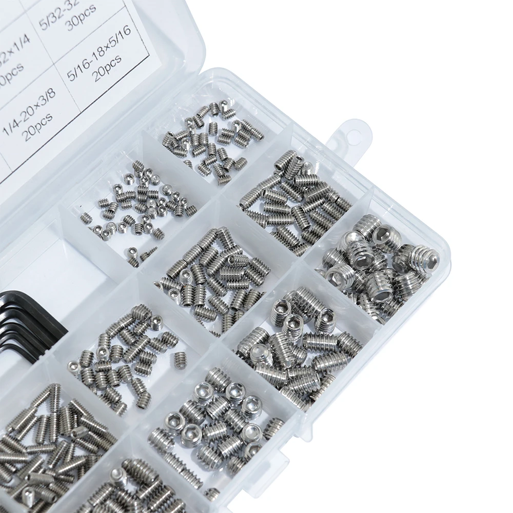 410Pcs 5/16 1/4 3/16 5/32 1/8 304 Rozsdamentes Acélból Készült Császári Beállítási Csavar Hex Aljzat Hüvelyk Hüvelykes Csavaros Választéka 5 Csavarkulccsal