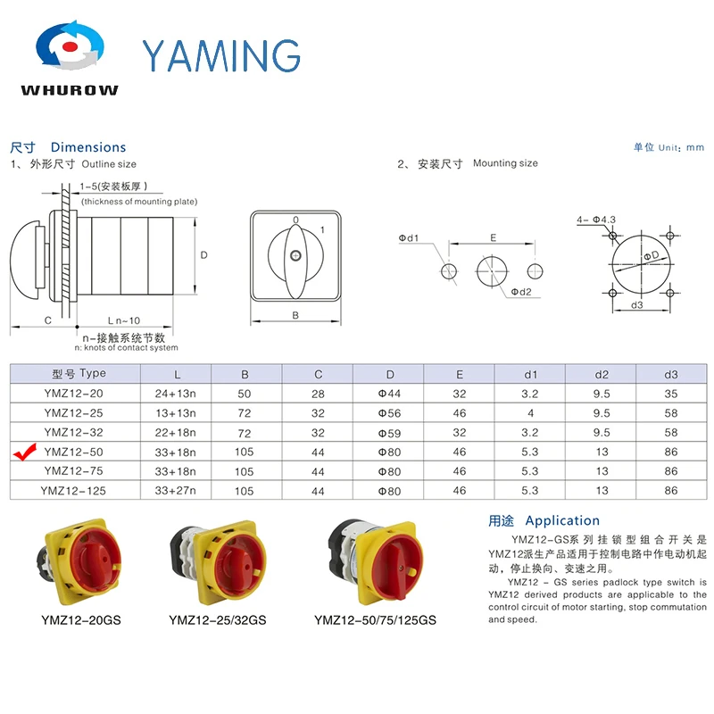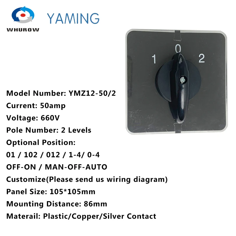 50A 2 Oszlopok 8 Terminálok Forgó Cam Kapcsoló Univerzális Váltás Válassza Ki A Megszakító Opcionális Pozíciókat Ymz12-50/2