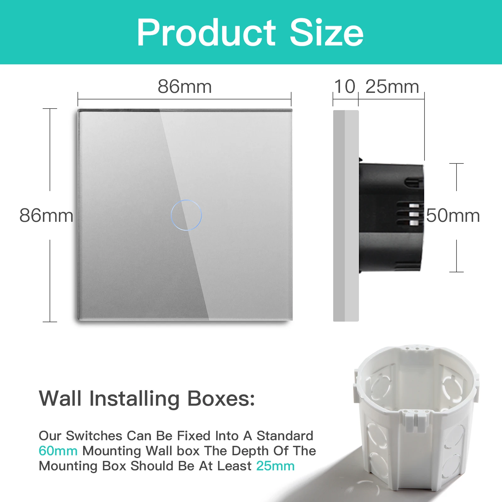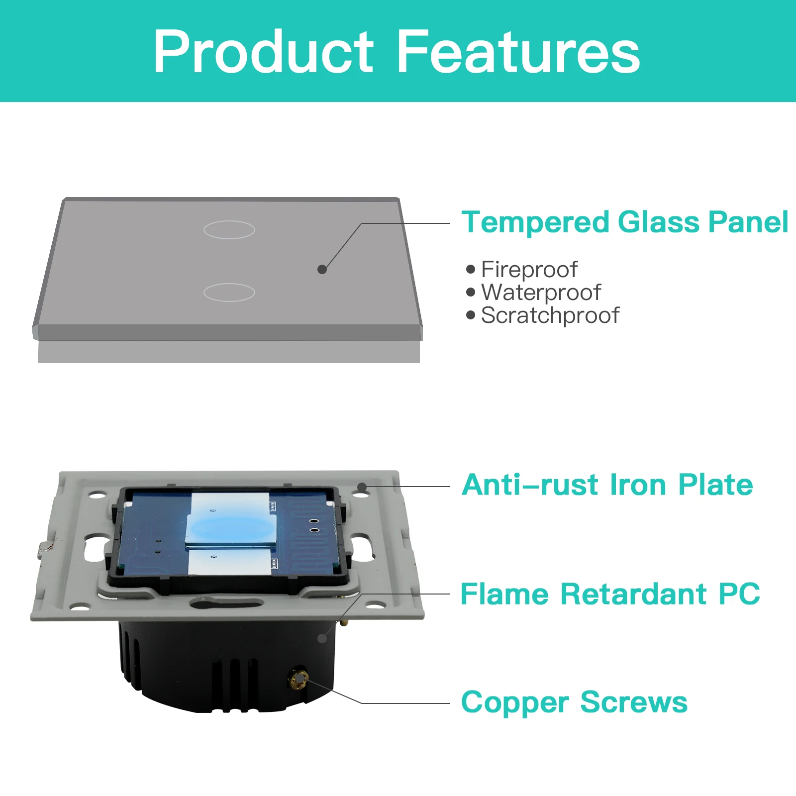 - Material: Glass Panel &Iron Plate & Plastic Switch Module