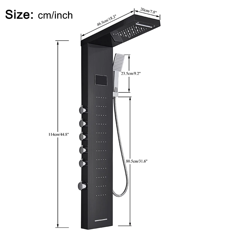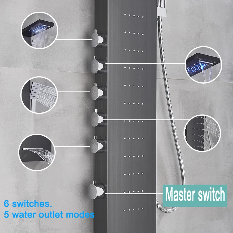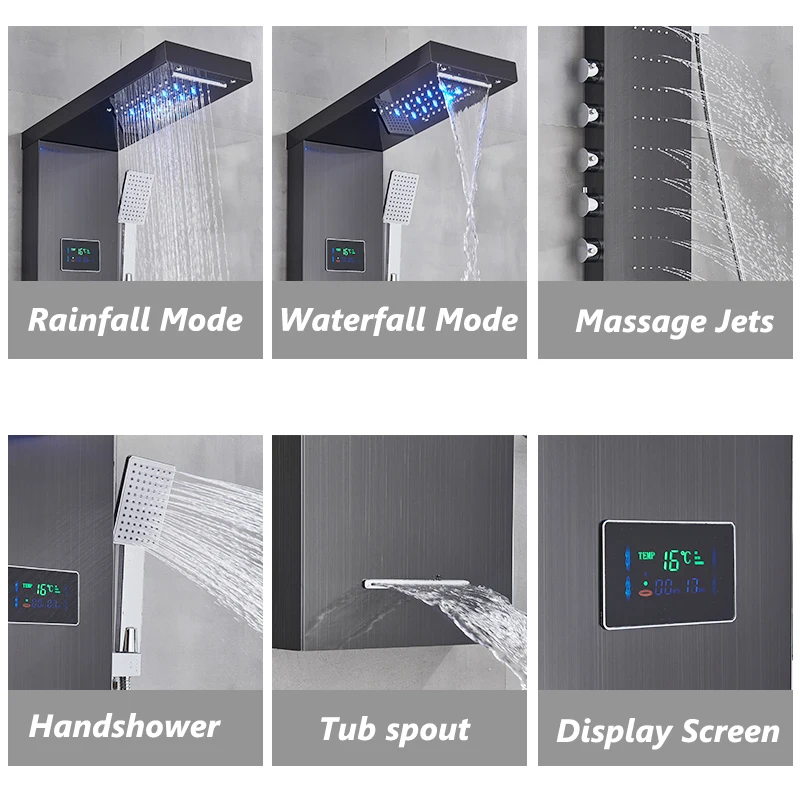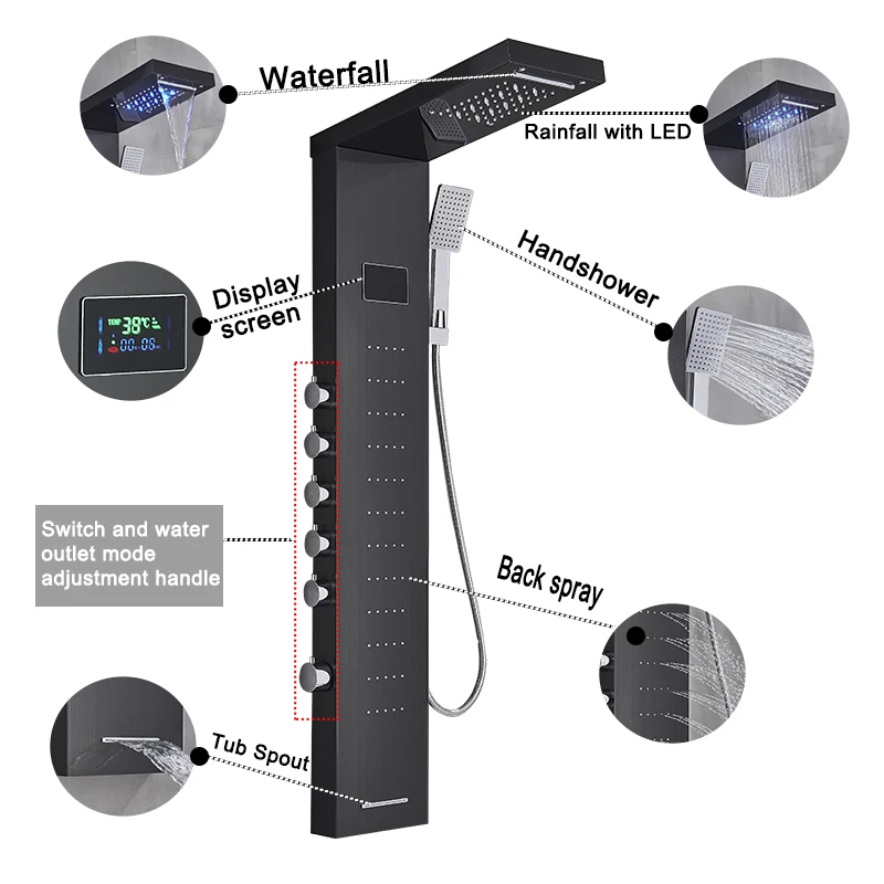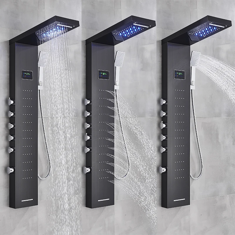 Luxus Fekete/Szálcsiszolt Zuhanylap Falra Szerelt Fürdőszekrény-Oszlop Keverő Led-Es Fény Víz Vízvízaláfutással 5-Funkcióval