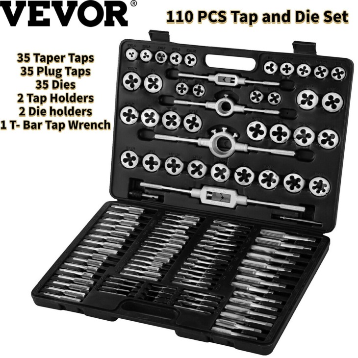 Vevor 110 Pcs Tap És Die Set M2-M18 Drill Tap Set Metric Hand Threading Csavarkulcs Tools Tungsten Acél Állítható W / Storage Tok