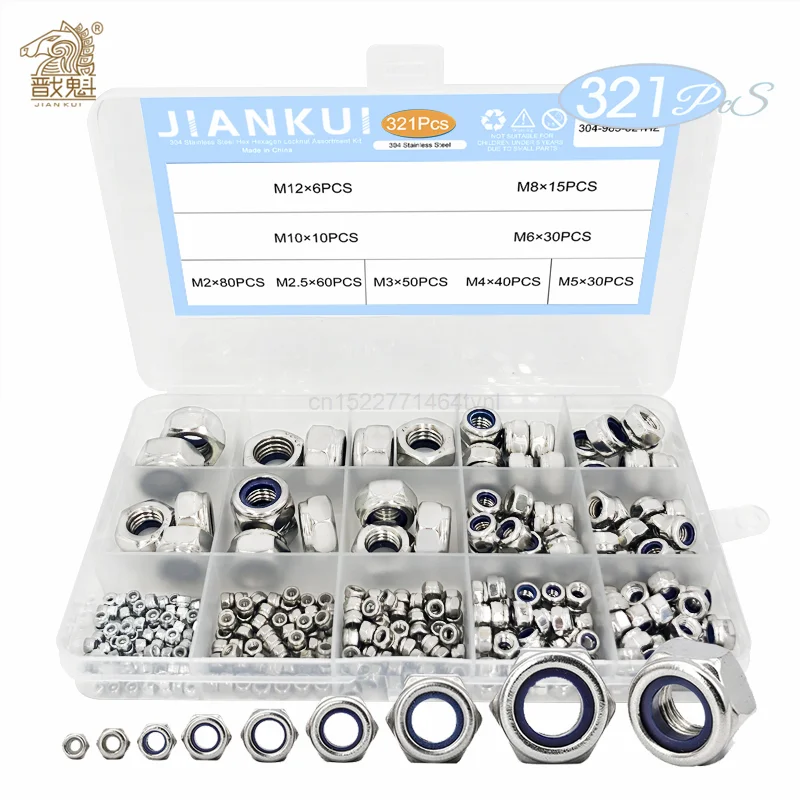 321Pcs Nylon Záróanya 304 Rozsdamentes Acél M2 M2.5 M3 M4 M5 M8 M10 M12 Hexagon Önzáró Anya Választékkészlet