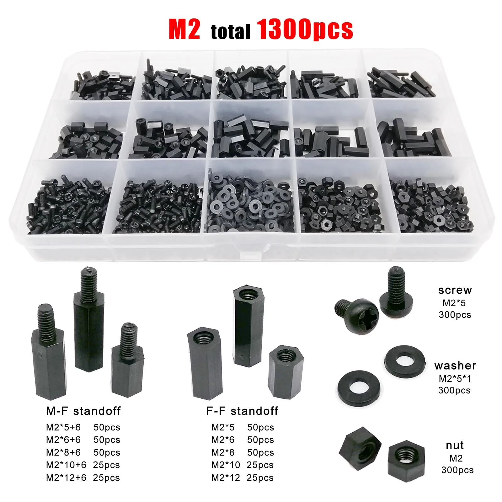 445/1300Pcs M2 M2.5 M3 M4 Fekete Műanyag Nylon Szigetelt Hexa Kioldó Hatszög Oszlop Spacer Csavar Anya Választékkészlet Készlet