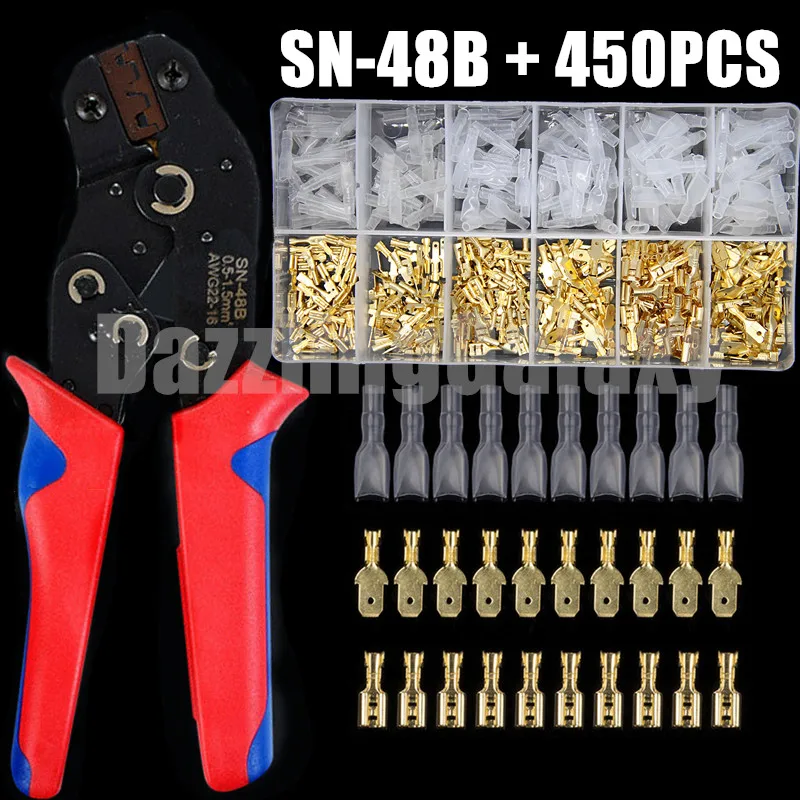 450Pcs 2,8/4,8/6,3 Mm Anya Hím Elektromos Ásóhuzalt Fenekű Csatlakozók Fülek Akkumulátor Indító Kábelelszívítő Krimpelnöki Készlet