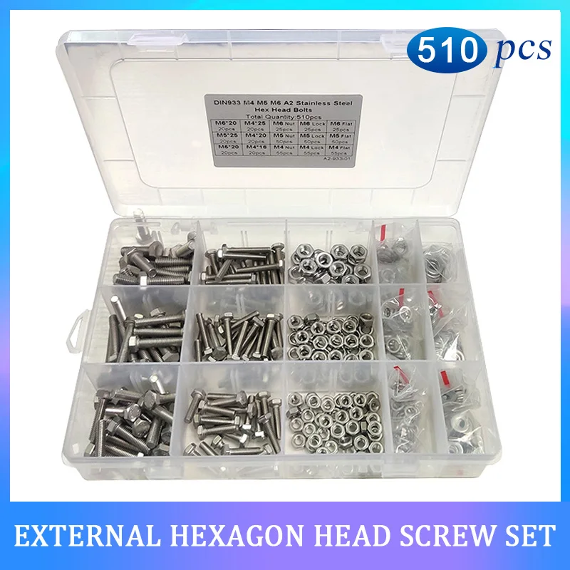 510Pcs Külső Hex Hexagon Fej Csavar Beállítása M4 M5 M6 Bolt Bicker Csoprokok Szerkesztések És Duns Lak /Tavaszi Mosóválasztékkészlet
